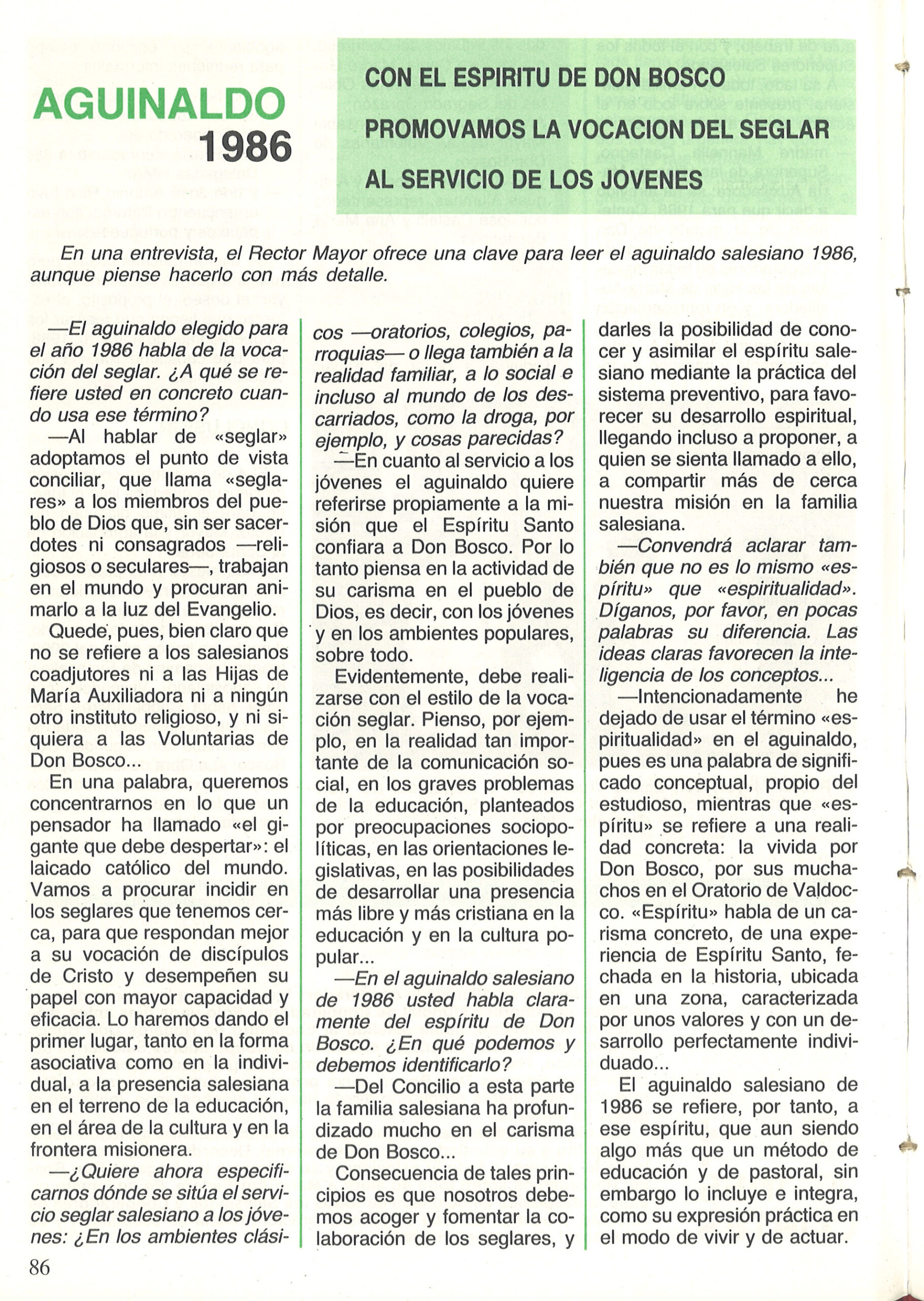 En el número 265 de diciembre de 1985 en su página 86 se publica una entrevista con el Rector Mayor don Egidio Viganò acerca del Aguinaldo de 1986 bajo el título «Con el Espíritu de Don Bosco promovamos la vocación del seglar al servicio de los jóvenes».